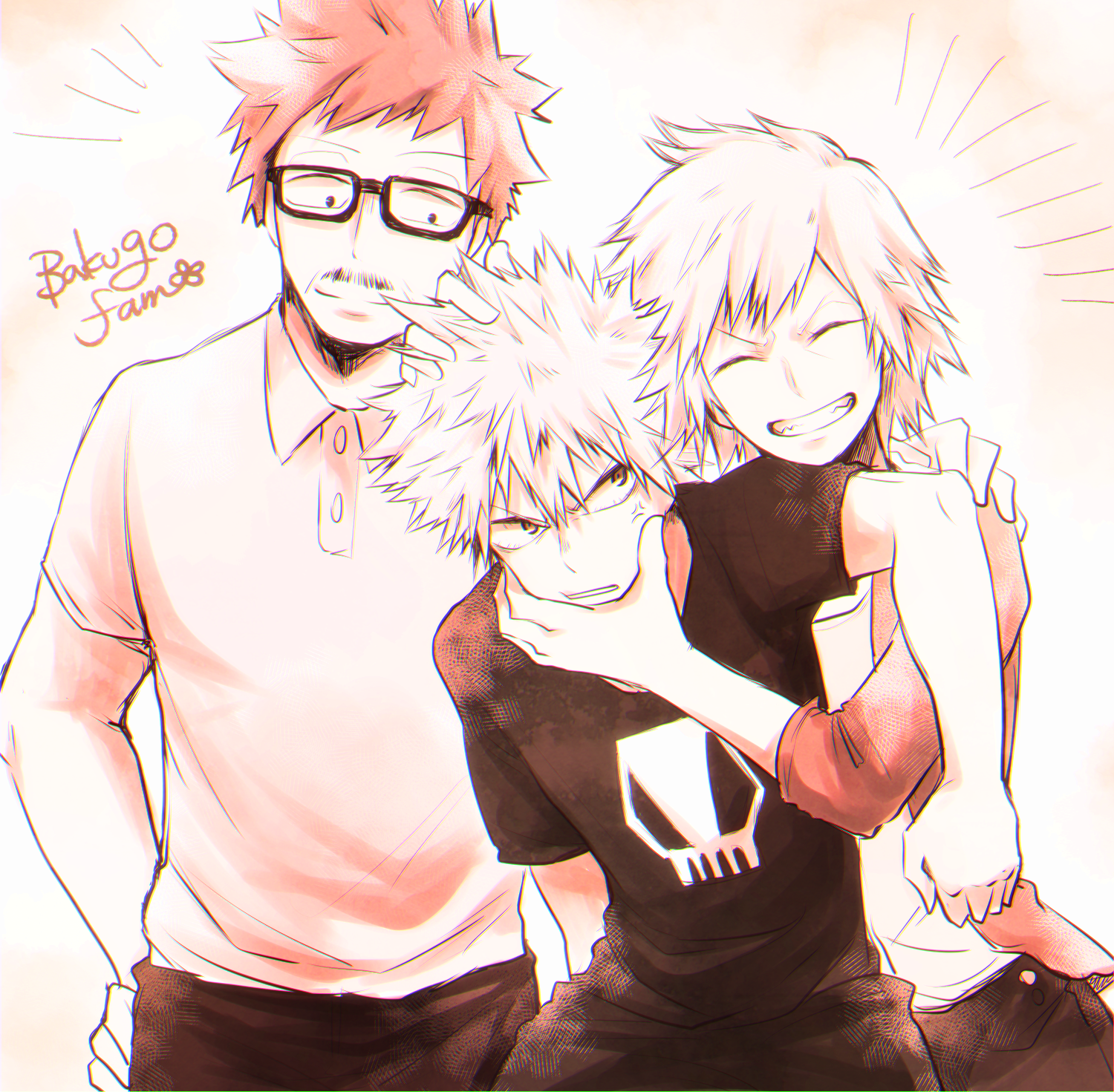 Safebooru 1girl 2boys Anger Vein Azu Ciao07 Bakugou Katsuki Bakugou Katsuki S Dad Bakugou Katsuki S Mom Boku No Hero Academia Chromatic Aberration Family Father And Son Glasses Grin Highres Monochrome Mother And